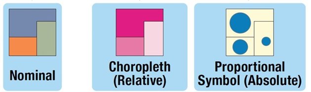 Thematic maps come in different types, with each type conveying a different visual metaphor. Choosing the appropriate thematic map type is guided by the nature of the data and the spatial patterns it should represent.