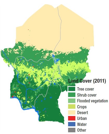 A dasymetric map representing four countries in Sub-Saharan Africa based on exclusionary data. Classified land cover processed from satellite imagery is used to identify areas where people do not live: desert and water. Kraak MJ et al. (2020)