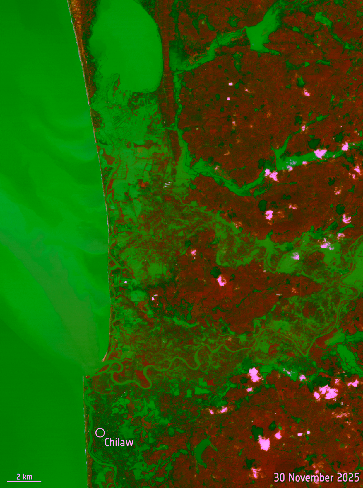 Copernicus Sentinel-2 captured an image over the region on 30 November 2025, as well as an image one month previously, showing the extent of flooding.