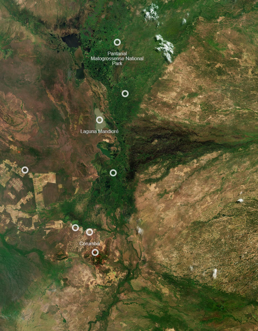 The two conurbations visible west of Corumbá are the inland ports of Puerto Suarez and Puerto Quijarro, on the Bolivian side of the border. The light brown patches on the left represent savanna and forest cleared for cattle pastures and ranches. The thin strips of land are most likely cultivated soybean fields.