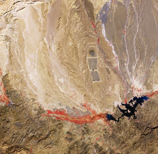 The large feature about 10 km north of the city is the Ouarzazate solar power station, also called Noor (Arabic for light) Power Station. Completed in four phases and covering over 3000 hectares, it is the world's largest concentrated solar power facility. Such plants use mirrors to focus sunlight onto receivers, generating heat that can be stored and converted into electricity even when the sun is not shining.