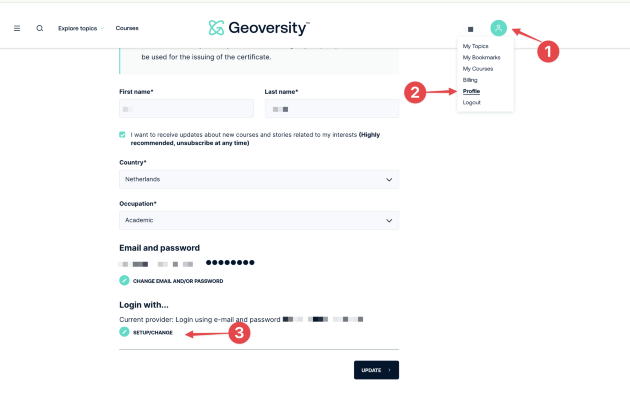 If you created an account on Geoversity before March 2026, you can also change the Single Sign-On method. To do so, you can follow the steps below.